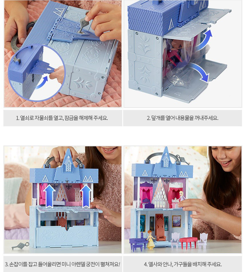 3.손잡이를 잡고 들어올리면 미니 아렌델 궁전이 펼쳐져요!