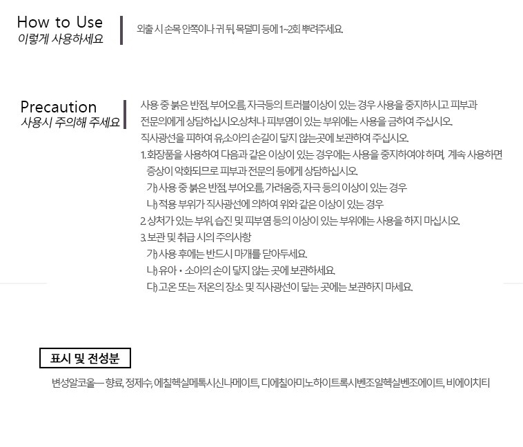외출시 손목 안쪽이나 귀 뒤,목덜미 등에 1~2회 뿌려 주세요