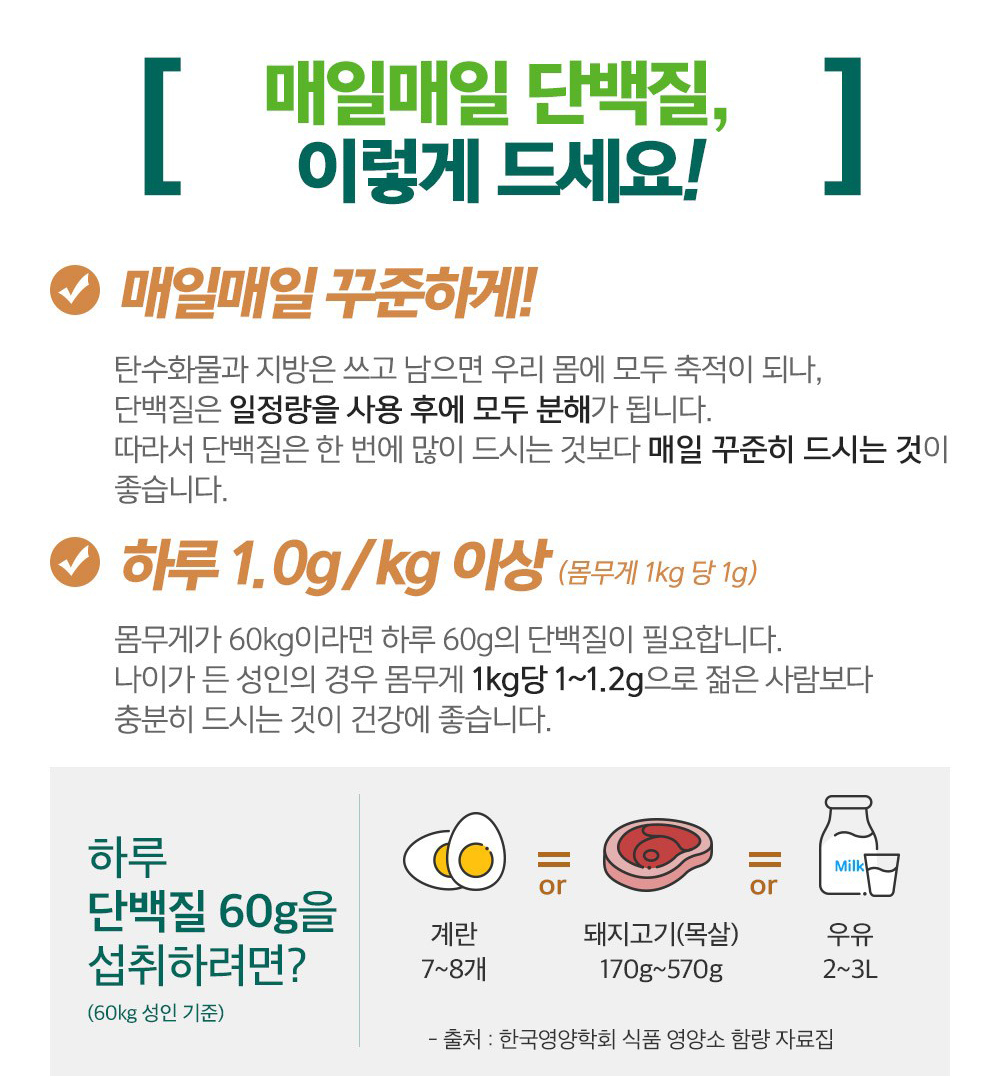 몸무게가 60kg이라면 하루 60g의 단백질이 필요합니다.