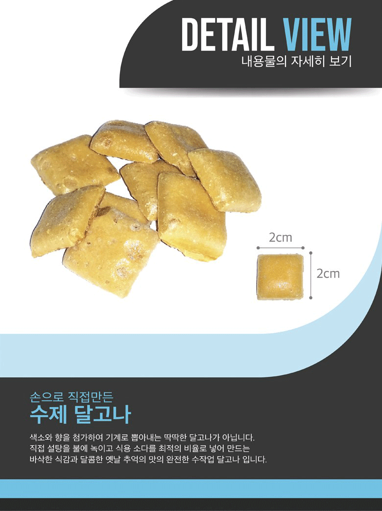 색소와 향을 첨가하여 기계로 뽑아내는 딱딱한 달고나가 아닙니다.
