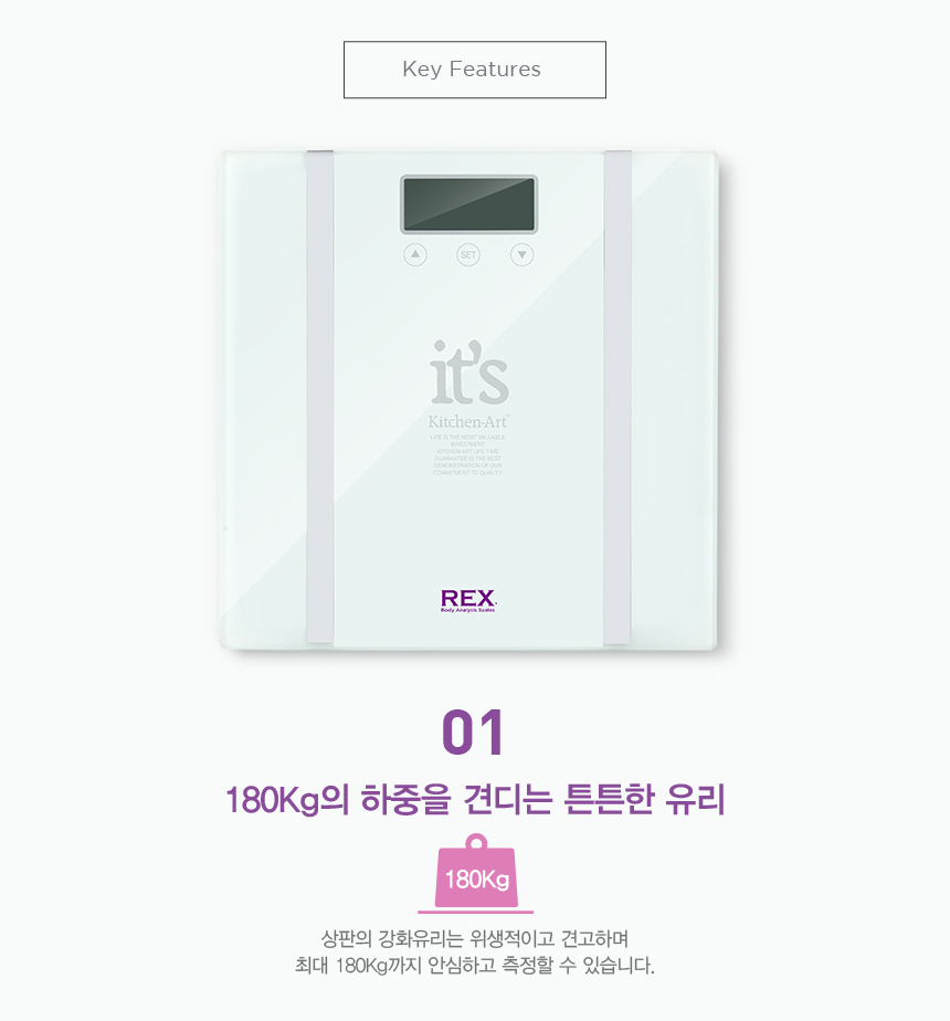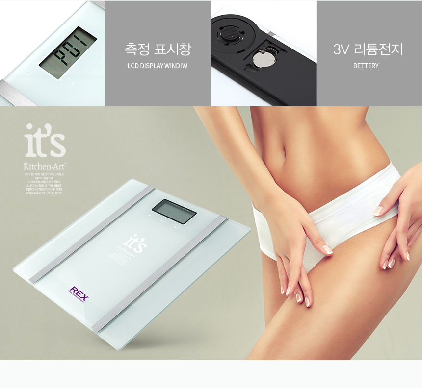 키친아트 렉스 체지방 체중계는 일반 체중계와 달리 한번의 측정으로 체지방/체수분/근육율/공량 등을 표시해 주는 다기능 체중계입니다.