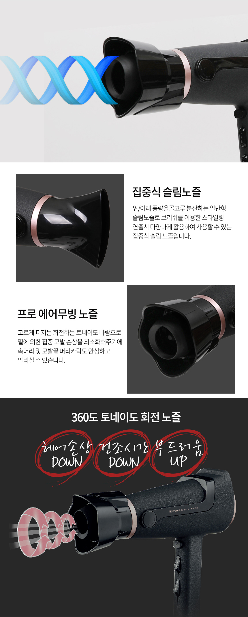 고르게 퍼지는 회전하는 토네이도 바람으로 열의 의한 집중 모발 손상을 최소화해주기에 속머리 및 모발끝 머리카락도 안심하고 말리실 수 있습니다.