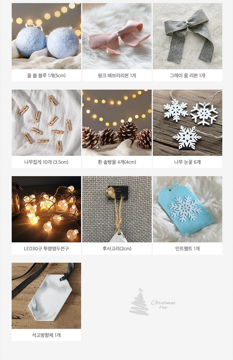 흰 솔방울 4개,나무 눈꽃 6개,LED30구 투명앵두전구,후사고리,민트펠트 1개,석고방향제 1개