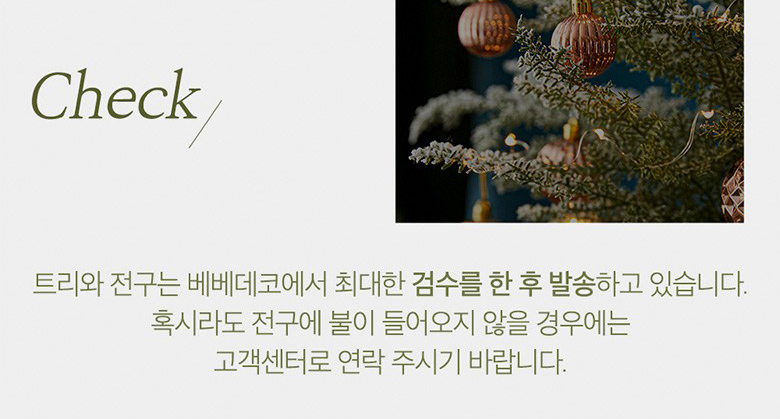트리와 전구는 베베데코에서 최대한 검수를 한 후 발송하고 있습니다.