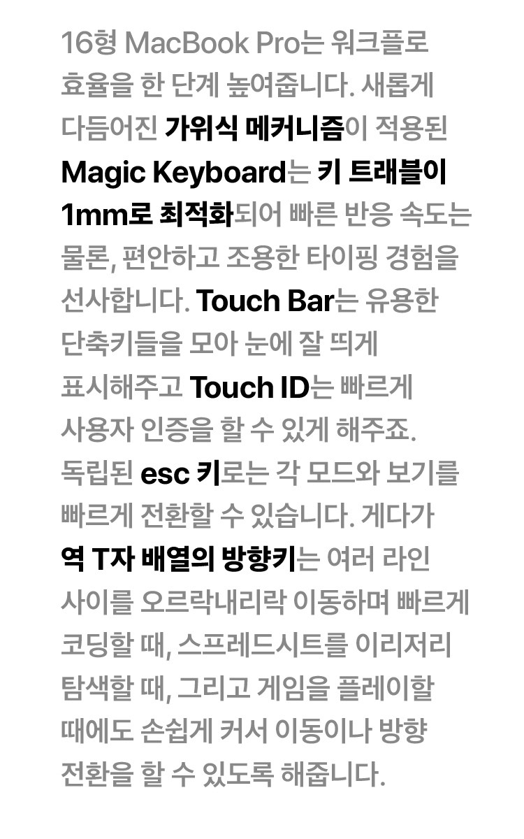 새롭게 다듬어진 가위식 메카니즘이 적용된 Magic Keyboard는 키 트래블이 1mm로 최적화 되어