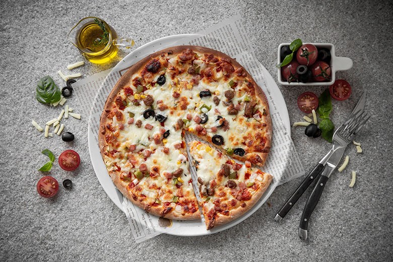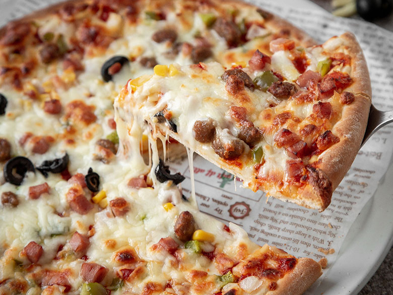 고소한 미트 토핑을 올린 고메 그릴피자 콤비네이션을 만나보세요.