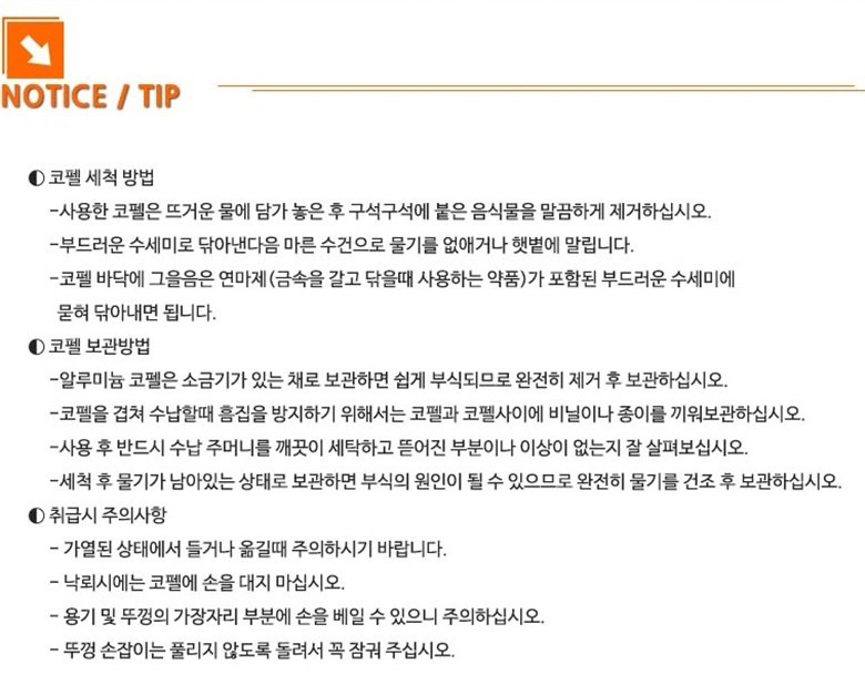 알루미늄 코펠은 소금기가 있는 채로 보관하면 쉽게 부식되므로 완전히 제거 후 보관하십시오.