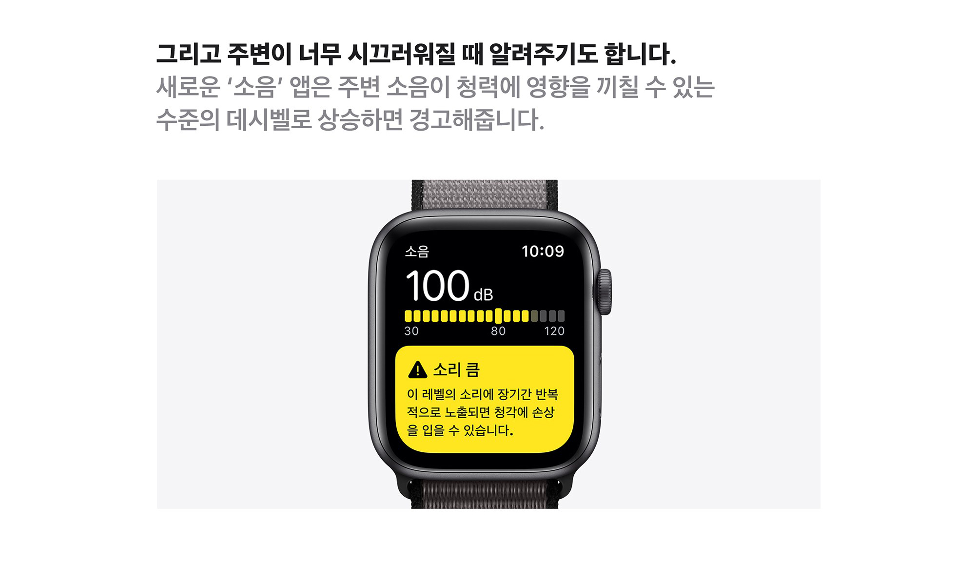 주변 소음이 청력에 영향을 끼칠수 있는 수준의 데시벨로 상승하면 경고해줍니다.