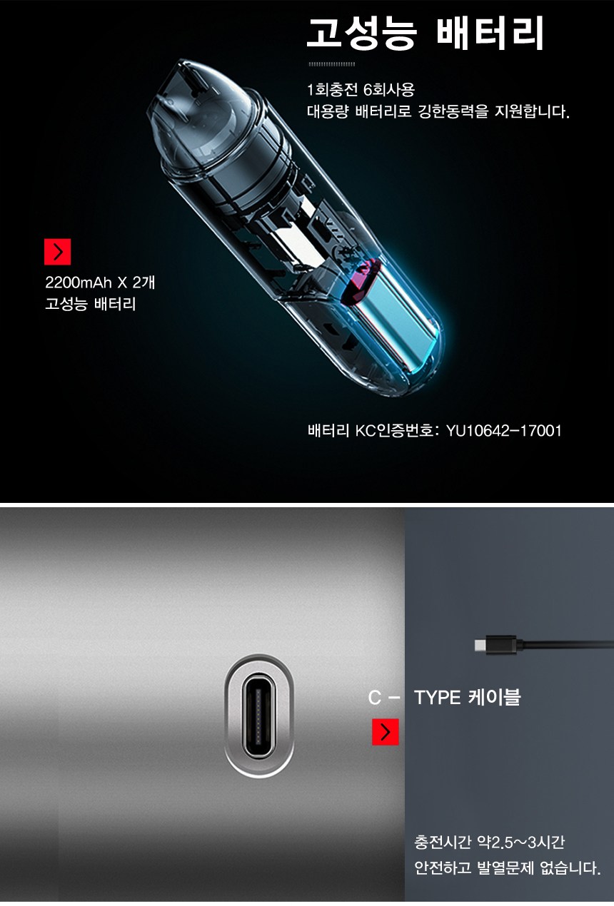 미끄럼방지 손잡이 / 전량 지시등 / 먼지방지 캡 / 빠른 충전 C-TYPE