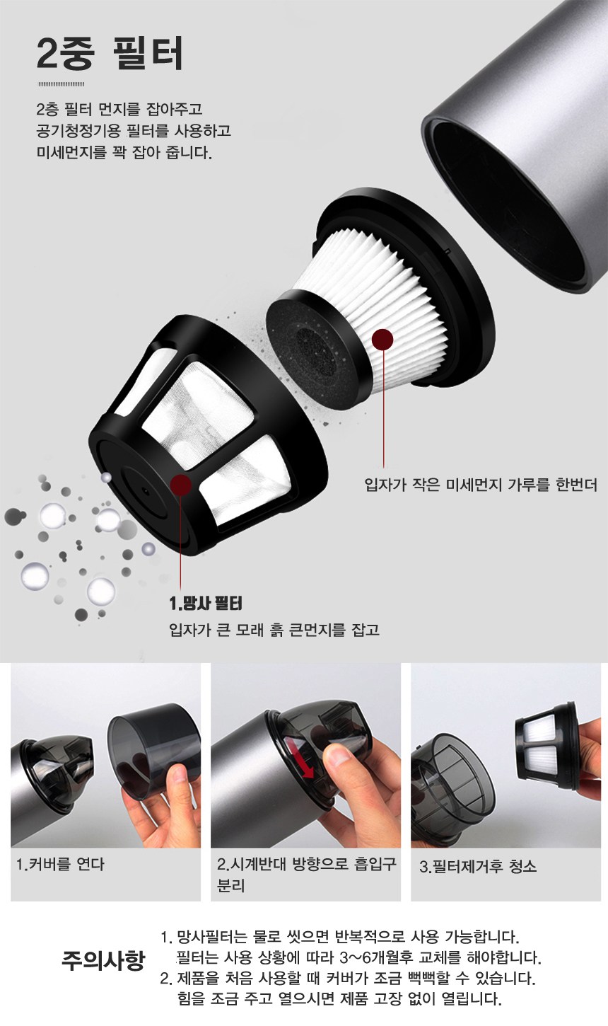 머리털 가루 / 과자 부스러기 / 모래 흙 / 동전 등 차안에 숨을만한 모든 쓰레기를 흡입합니다.