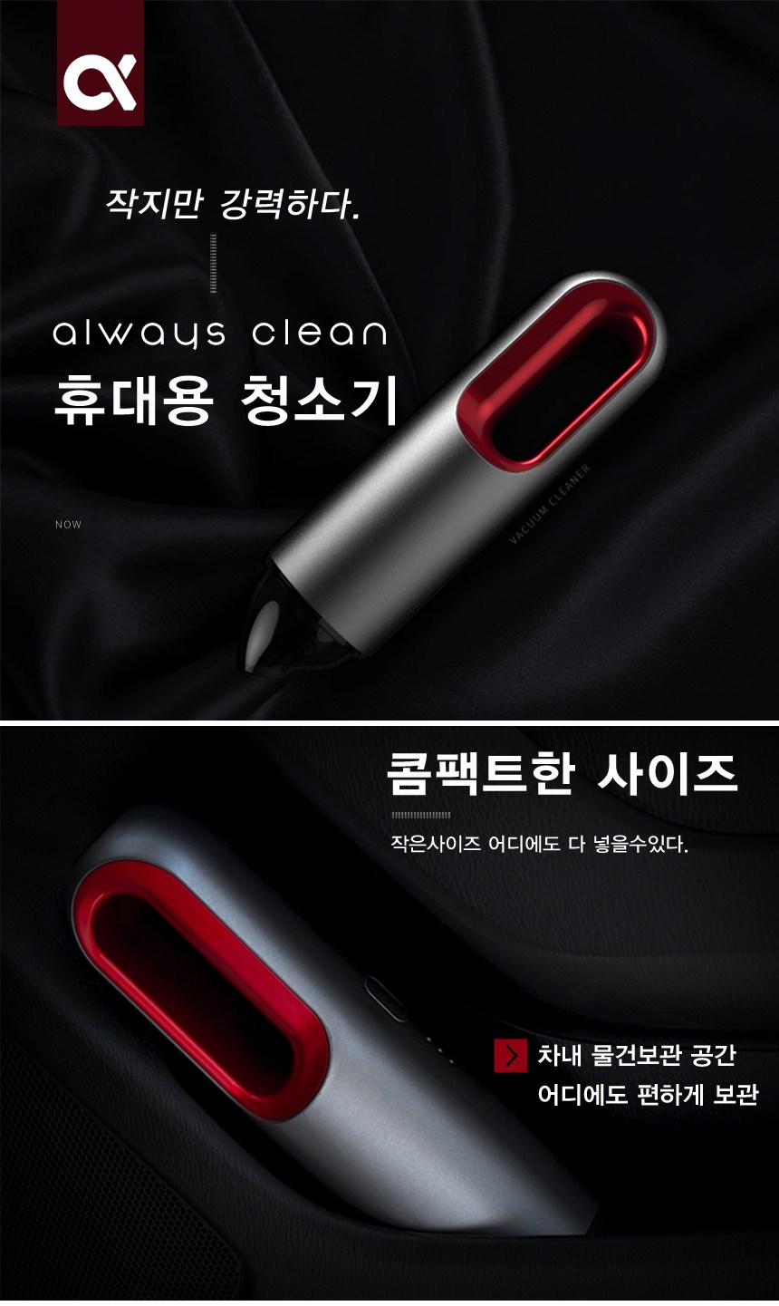 차안은 물론 좁은 공간에서 효율적으로 사용할 수 있으며 디자인도 심플한 Always Clean 무선청소기
