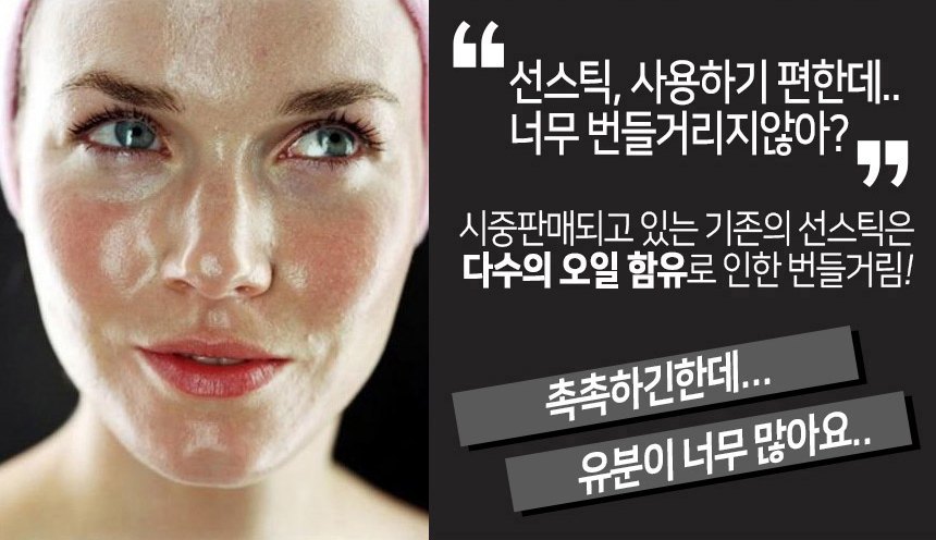 시중판매되고 있는 기존의 선스틱은 다수의 오일 함류로 인한 번들거림!