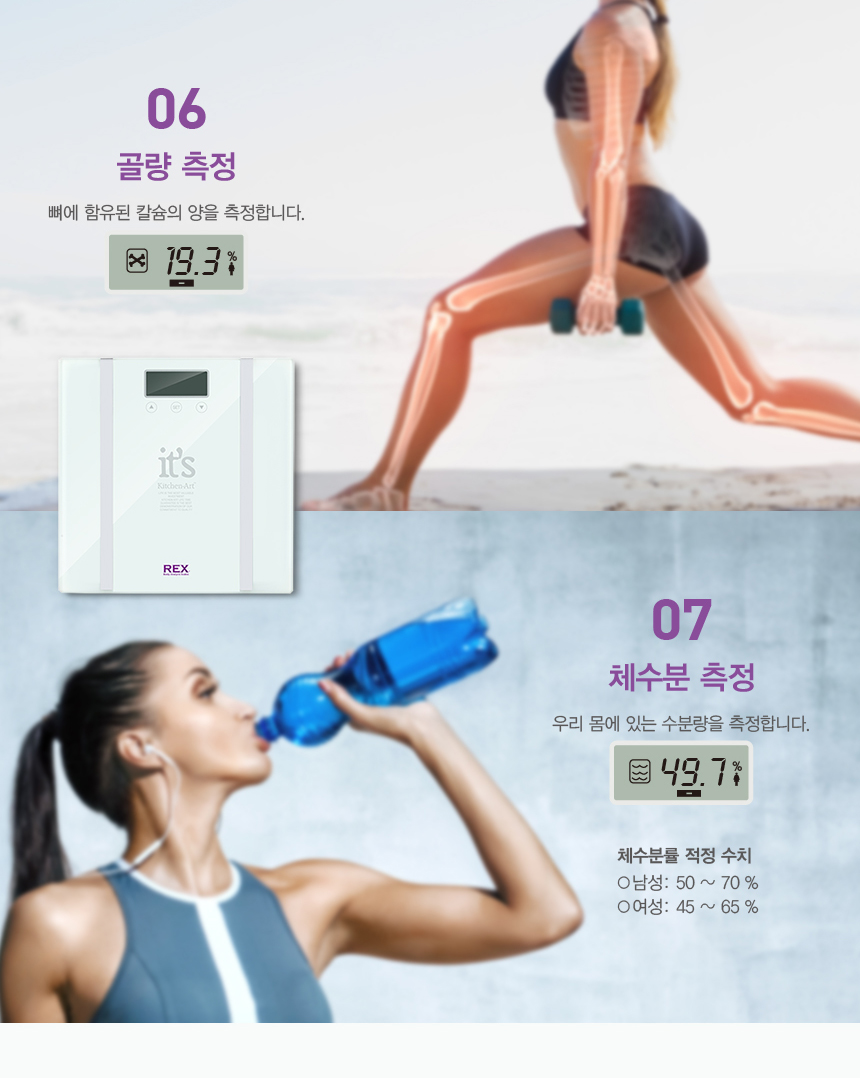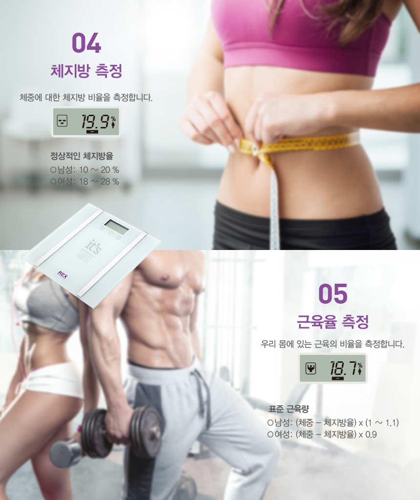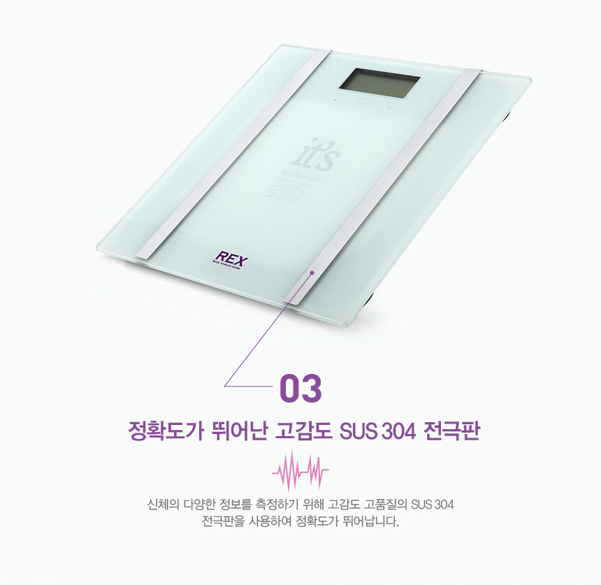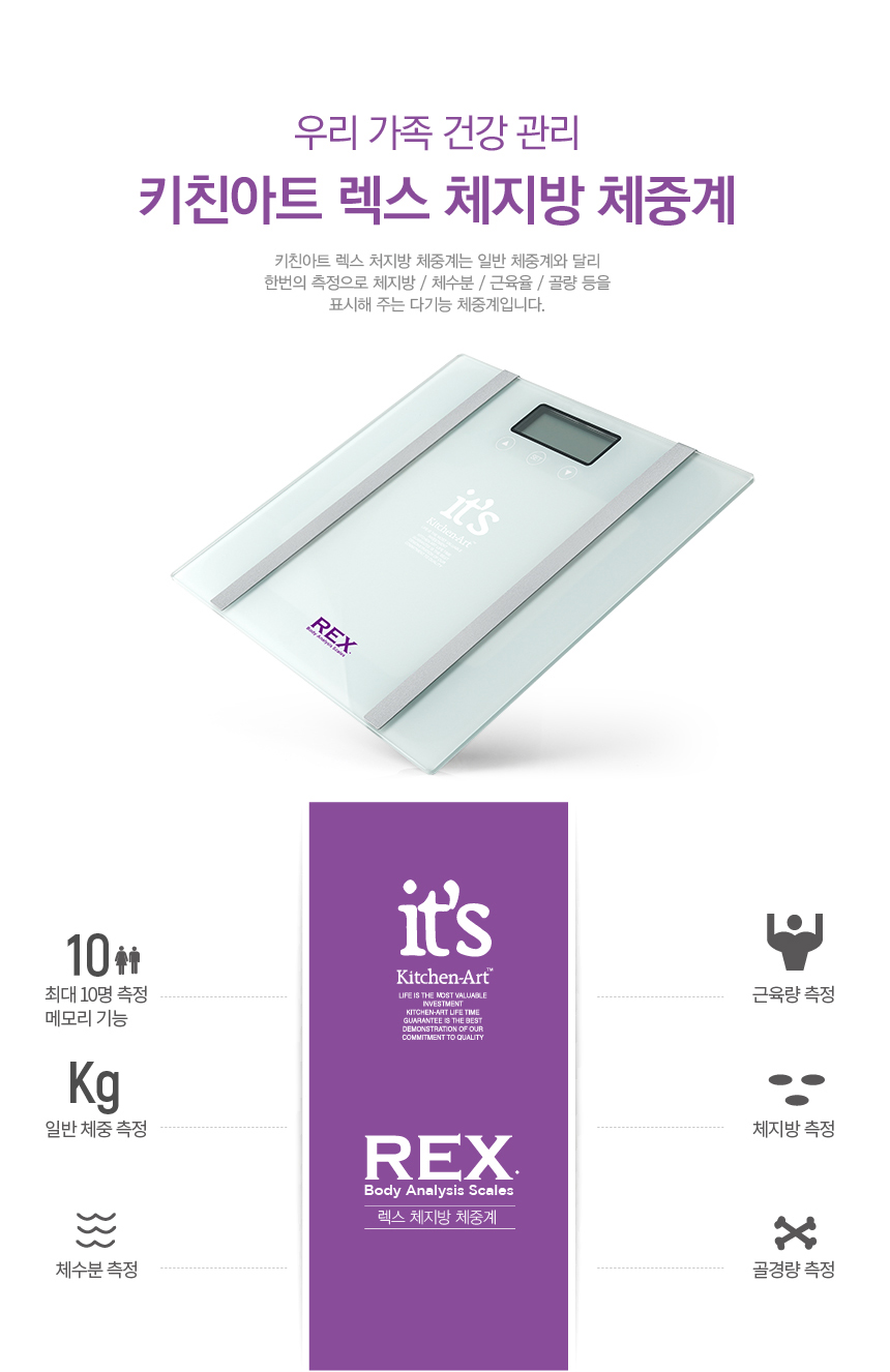 키친아트 렉스 체지방 체중계는 일반 체중계와 달리 한번의 측정으로 체지방/체수분/근육율/공량 등을 표시해 주는 다기능 체중계입니다.