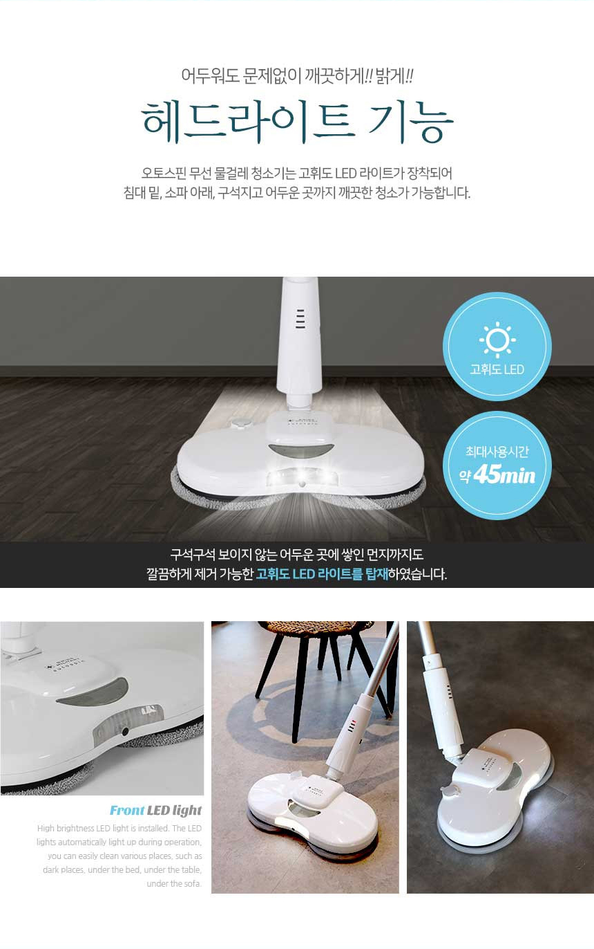 오토스핀 무선 물걸레 청소기는 고휘도 LED라이트가 장착되어 침대밑, 소파 아래, 구석지고 어두운곳까지 깨끗하게 청소가 가능합니다.