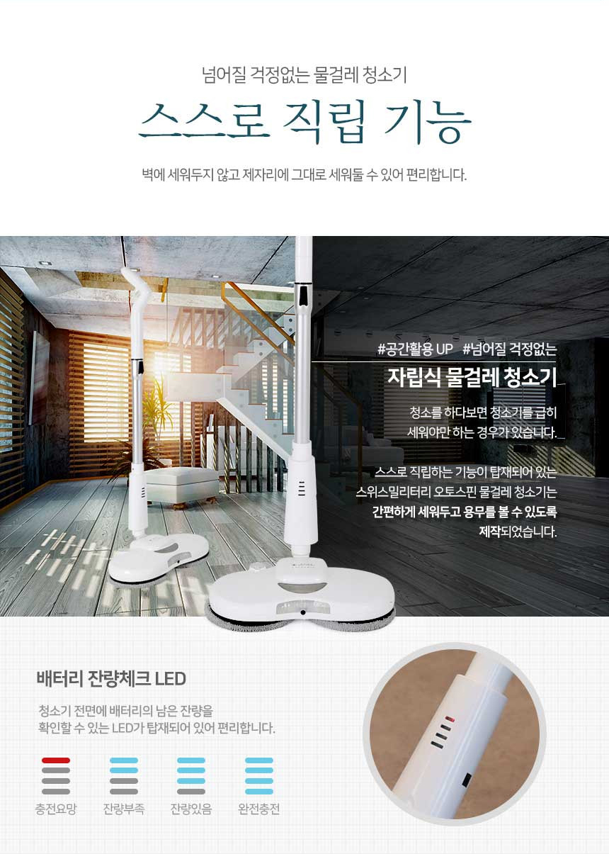 스스로 직립하는 기능이 탑제되어 있는 스위스밀리터리 오토스핀 물걸레 청소기는 간편하게 세워두고 용무를 볼 수 있도록 제작되었습니다.