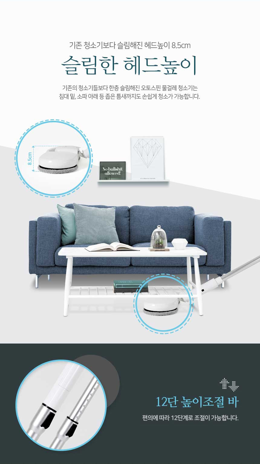 기존의 청소기들보다 한층 슬림해진 오토스핀 물걸레 청소기는 침대 밑, 소파 아래 등 좁은 틈새까지도 손쉽게 청소가 가능합니다.