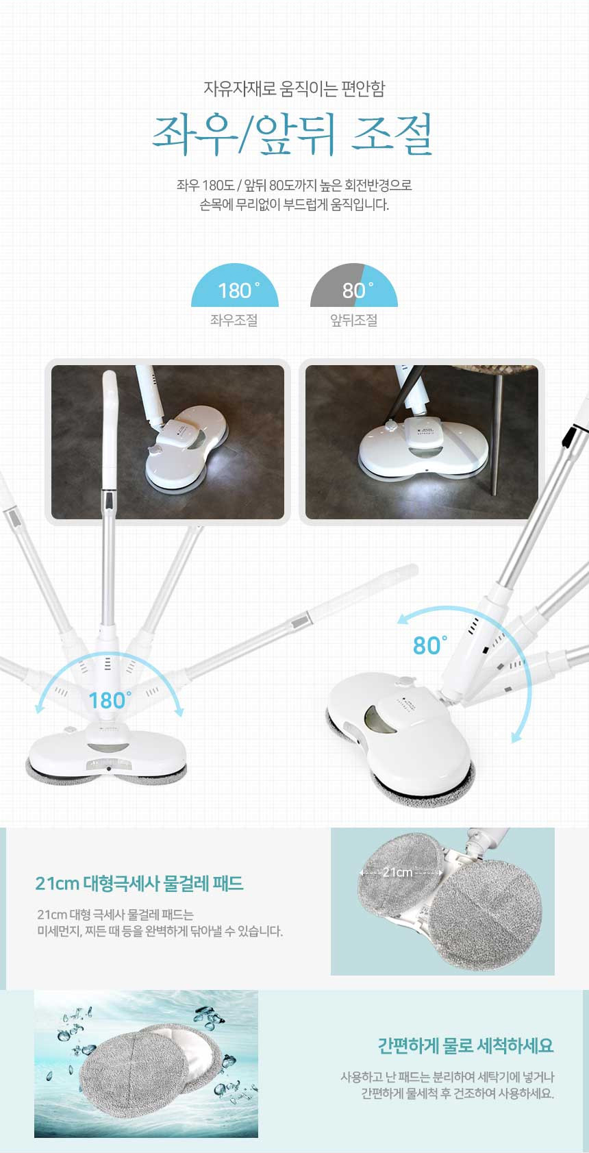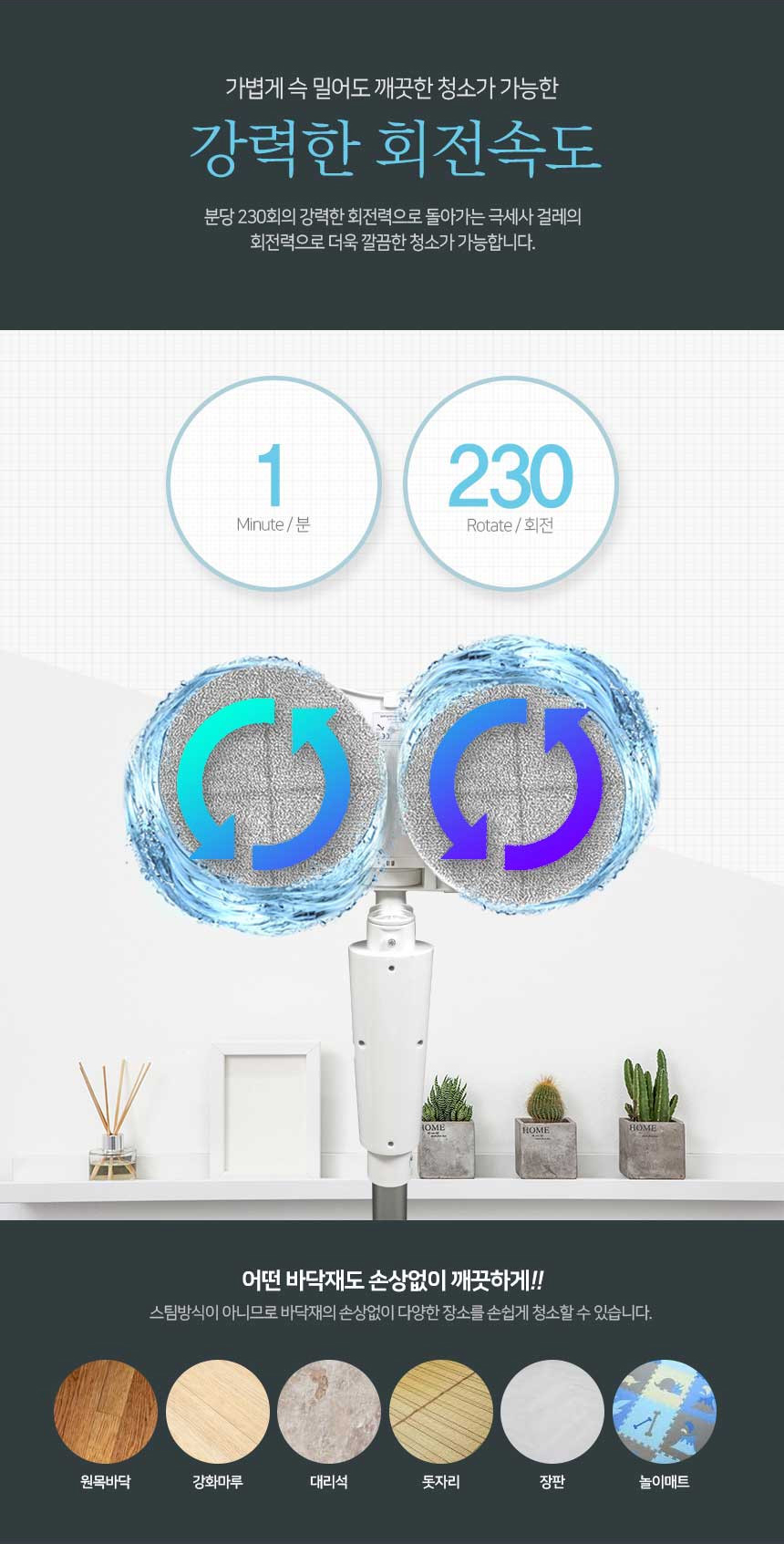 분당 230회의 강력한 회전력으로 돌아가는 극세사 걸레의 회전력으로 더욱 깔끔한 청소가 가능합니다.