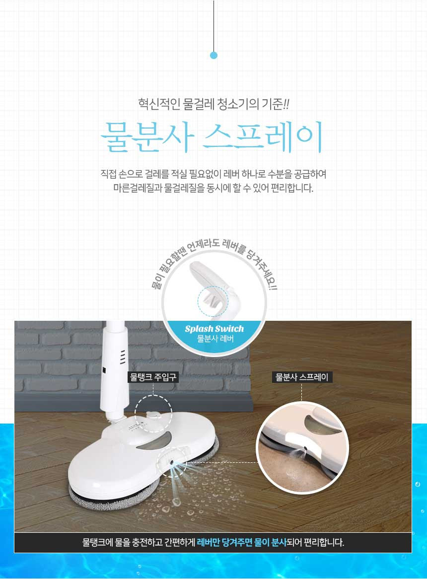 직접 손으로 걸레를 적실 필요없이 레버 하나로 수분을 공급하여 마른걸레질과 물걸레질을 동시에 할수 잇어 편리합니다.