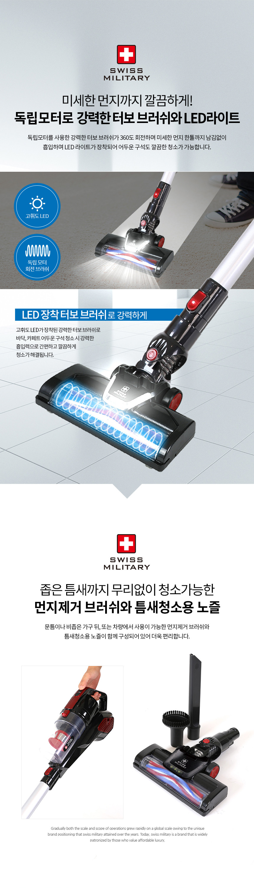 독립모터를 사용한 강력한 터보 브러쉬가 360도 회전하며 미세한 먼지 한톨까지 남김없이 흡입하며 LED 라이트가 장착되어 어두운 구석도 깔끔한 청소가 가능합니다.