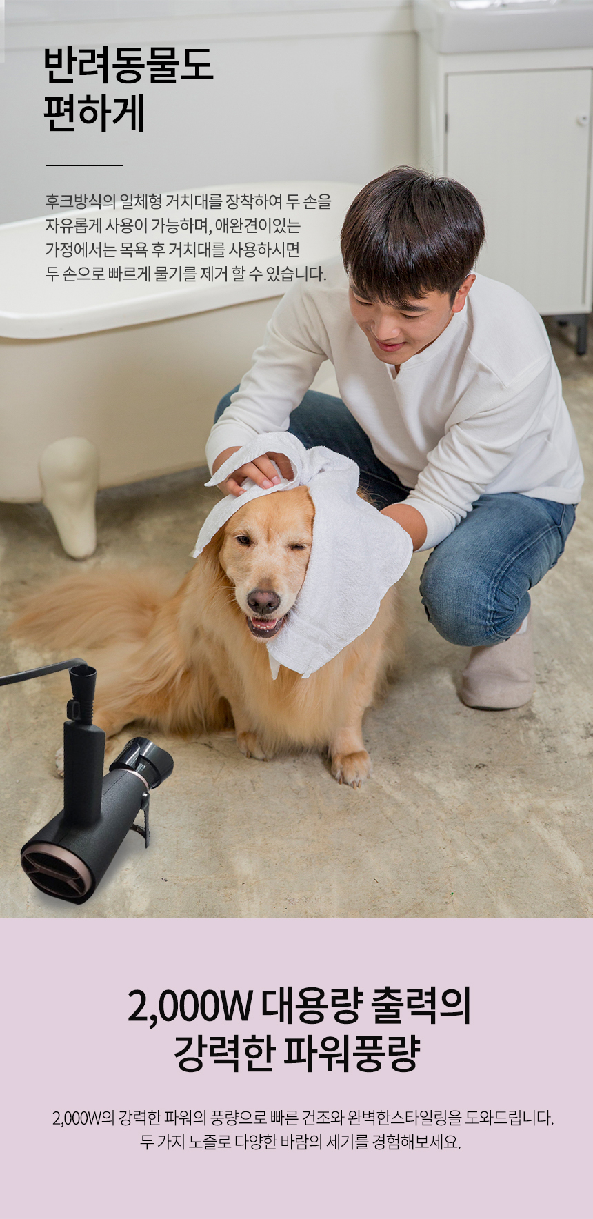 후크방식의 일체형 거치대를 장착하여 두손을 자요롭게 사용이 가능하며, 애완견이 있는 가정에서는 목욕 후 거치대를 사용하시면 두 돈으로 빠르게 물기를 제거 할 수 있습니다.